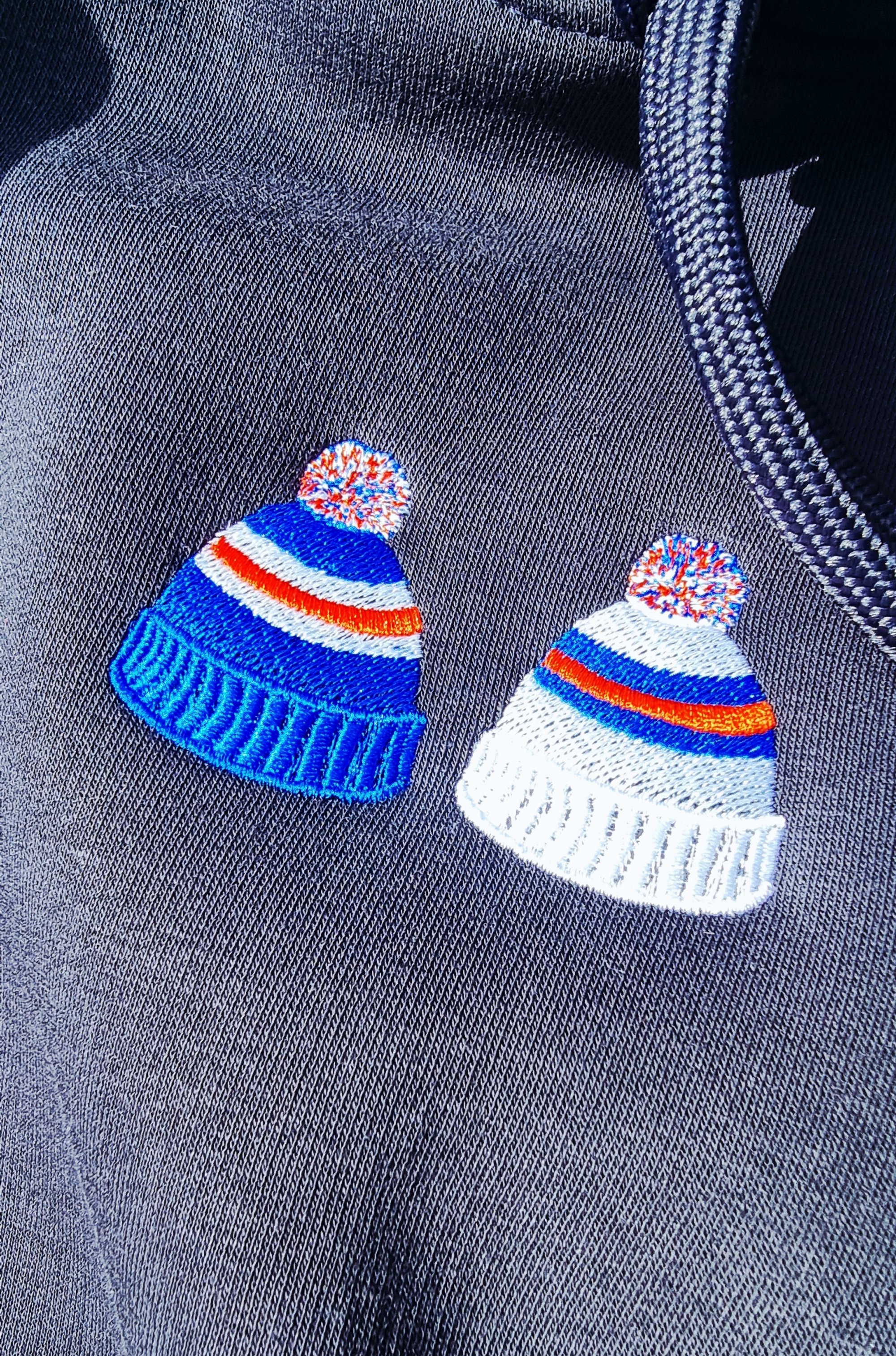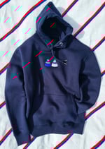 Home, away we will follow on. Navy unisex hooded top with high quality detailed embroidered twin logo in red, white & royal blue.