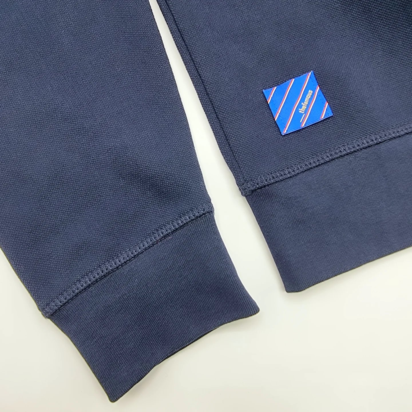 Navy unisex sweatshirt, with small embroidered bar scarf detail on left breast in Red, White & Royal Blue.
