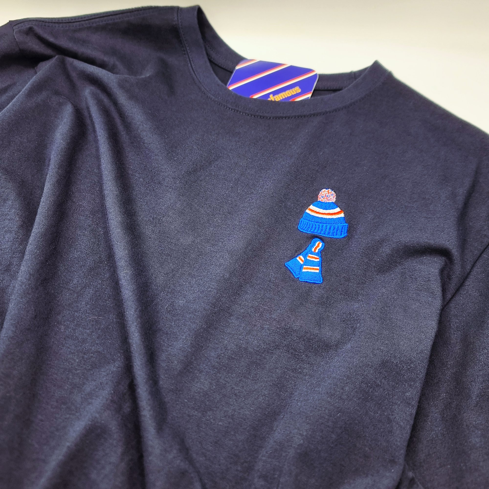 Navy unisex T-shirt with high quality detailed embroidered logo in red, white & royal blue.