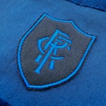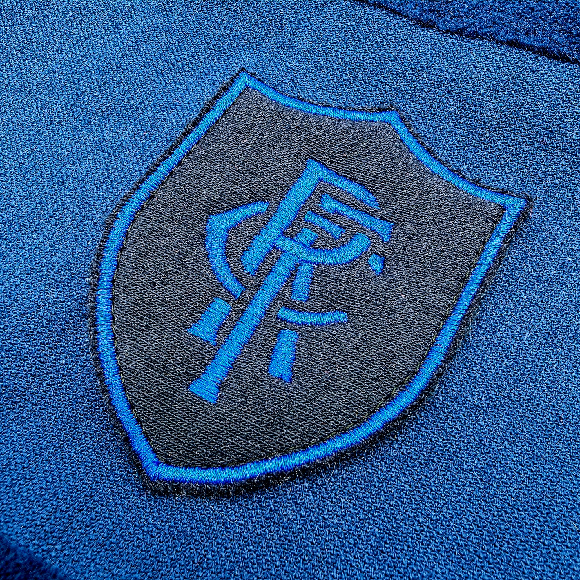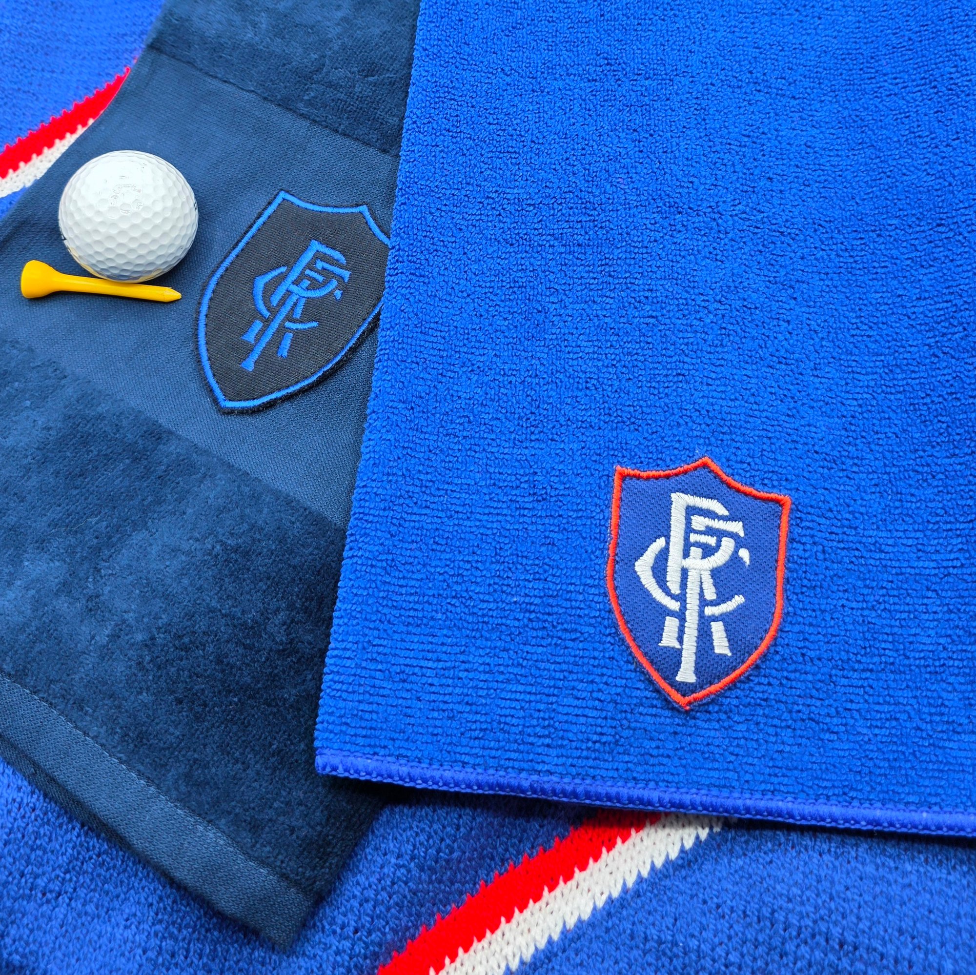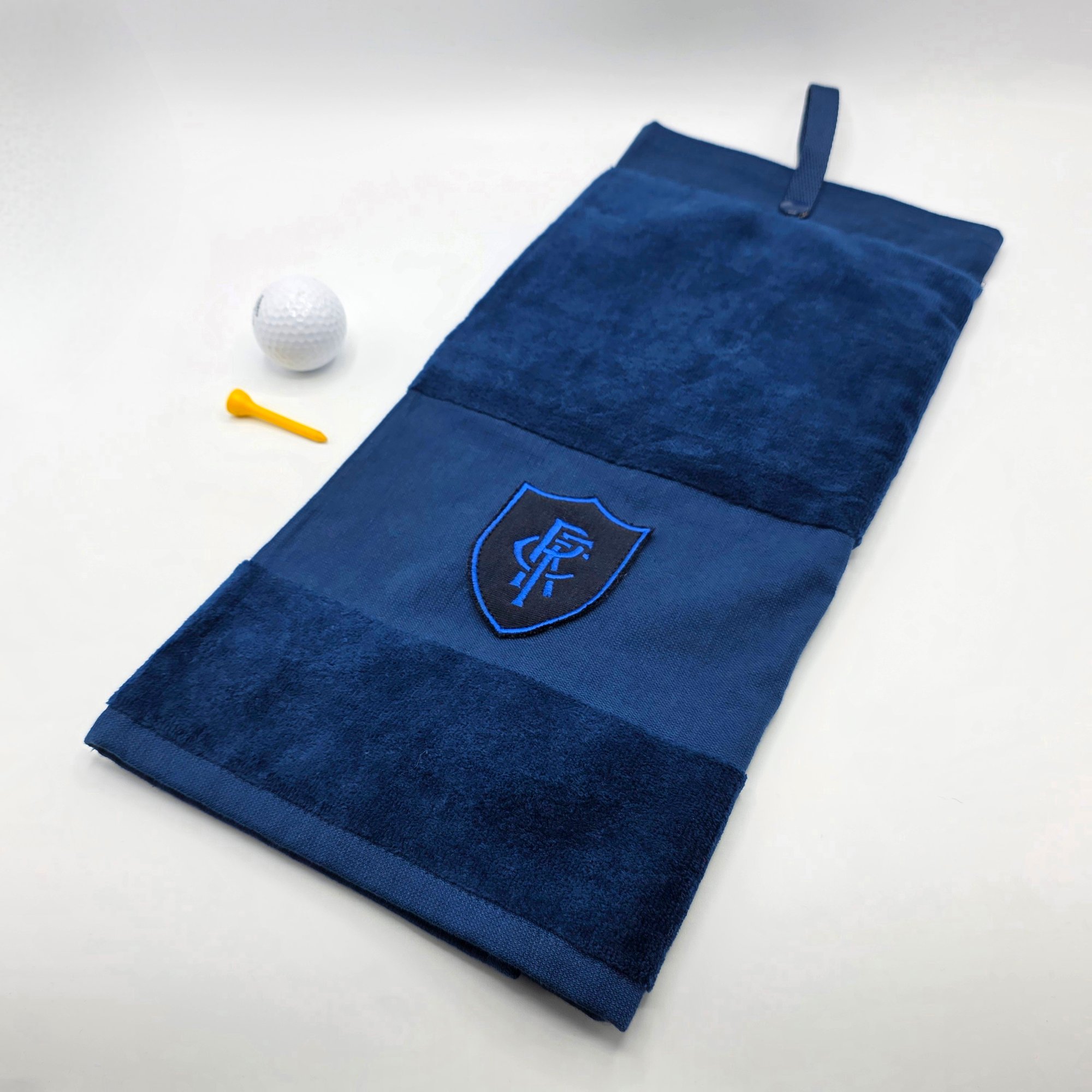 Navy 100% Cotton Luxury Velour Golf Towel. High quality embroidered patch to middle fold front, in Royal Blue and Navy. Trifold design, woven strap with YKK snap and popper fastening.