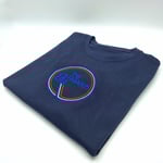 Navy unisex T-shirt with large high quality detailed embroidered logo in red, white & royal blue.