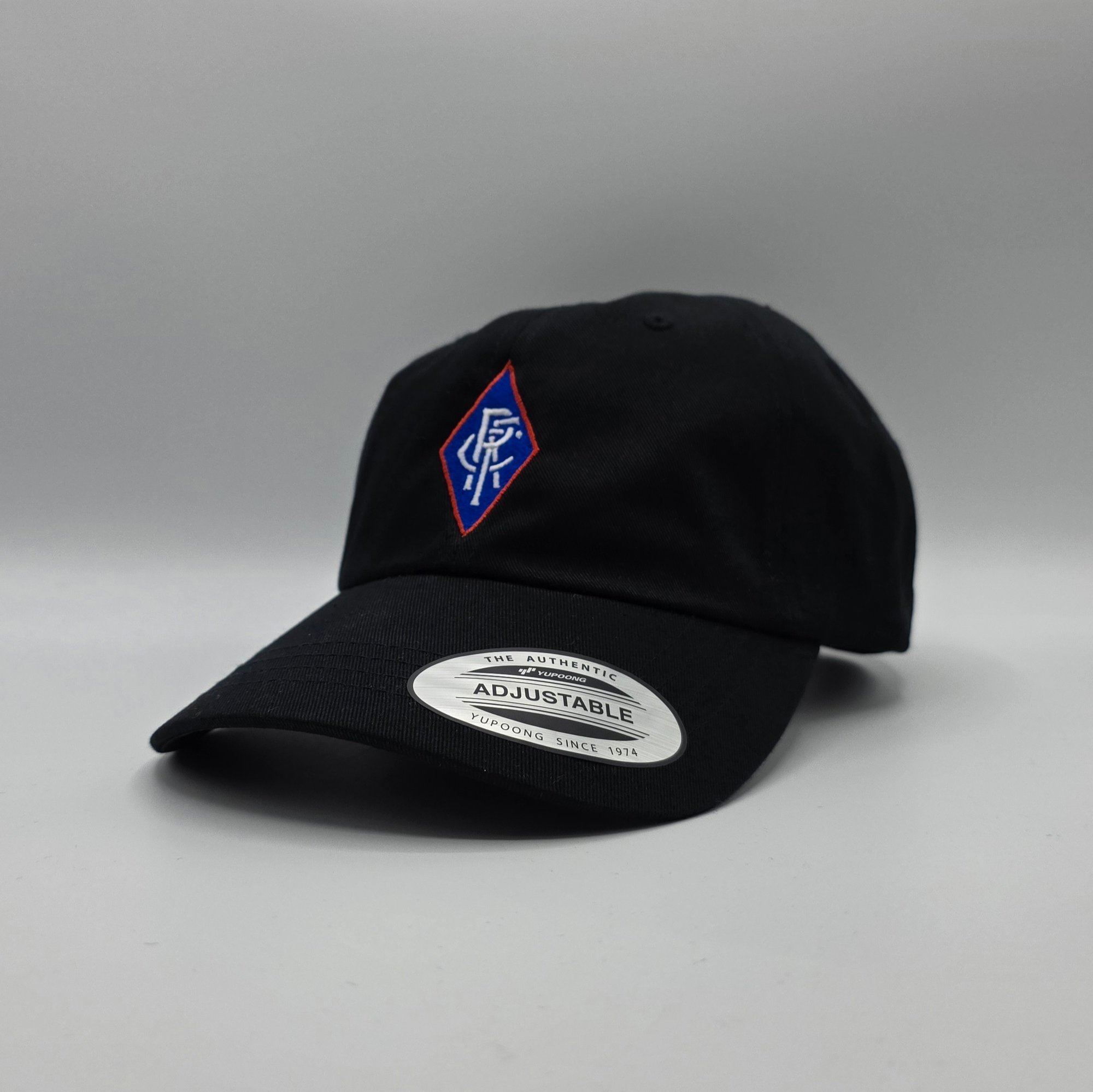 Black colour with Royal Blue, Red & White detail to front. 100% organic Cotton. One size, buckle fastening strap adjuster. Yupoong Cap.