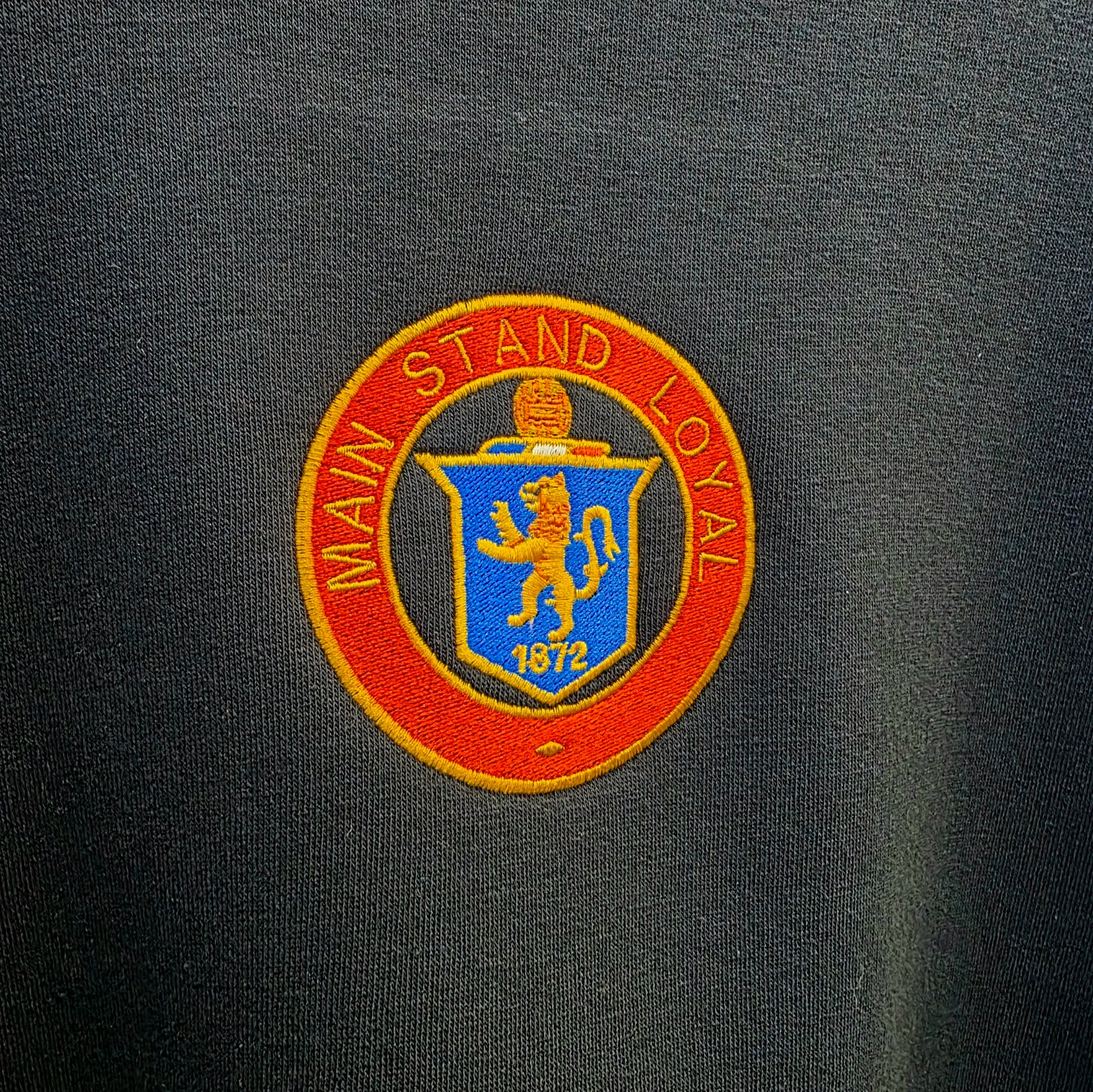 Navy unisex sweatshirt with high quality custom detailed embroidered logo centred front in Gold, Orange, Red, White & Royal Blue.